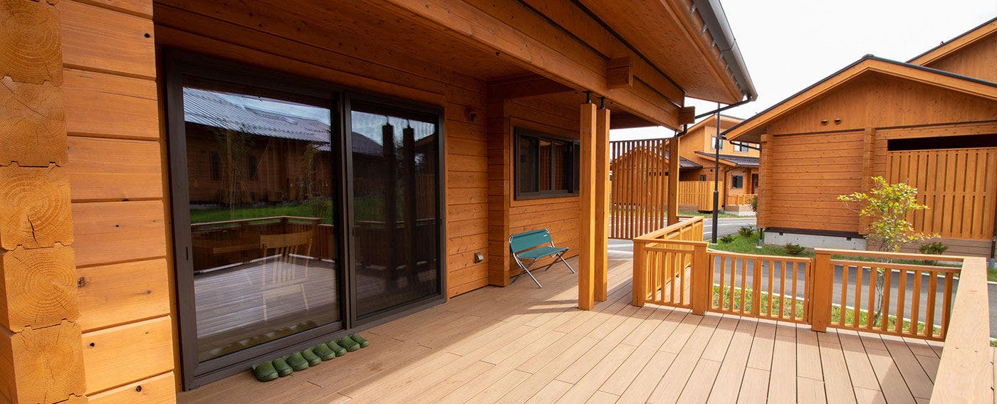 やさしい木のぬくもりを感じられる国産杉をふんだんに使用したログハウスと、和のプライベート空間で憩いのひと時をお過ごしください。