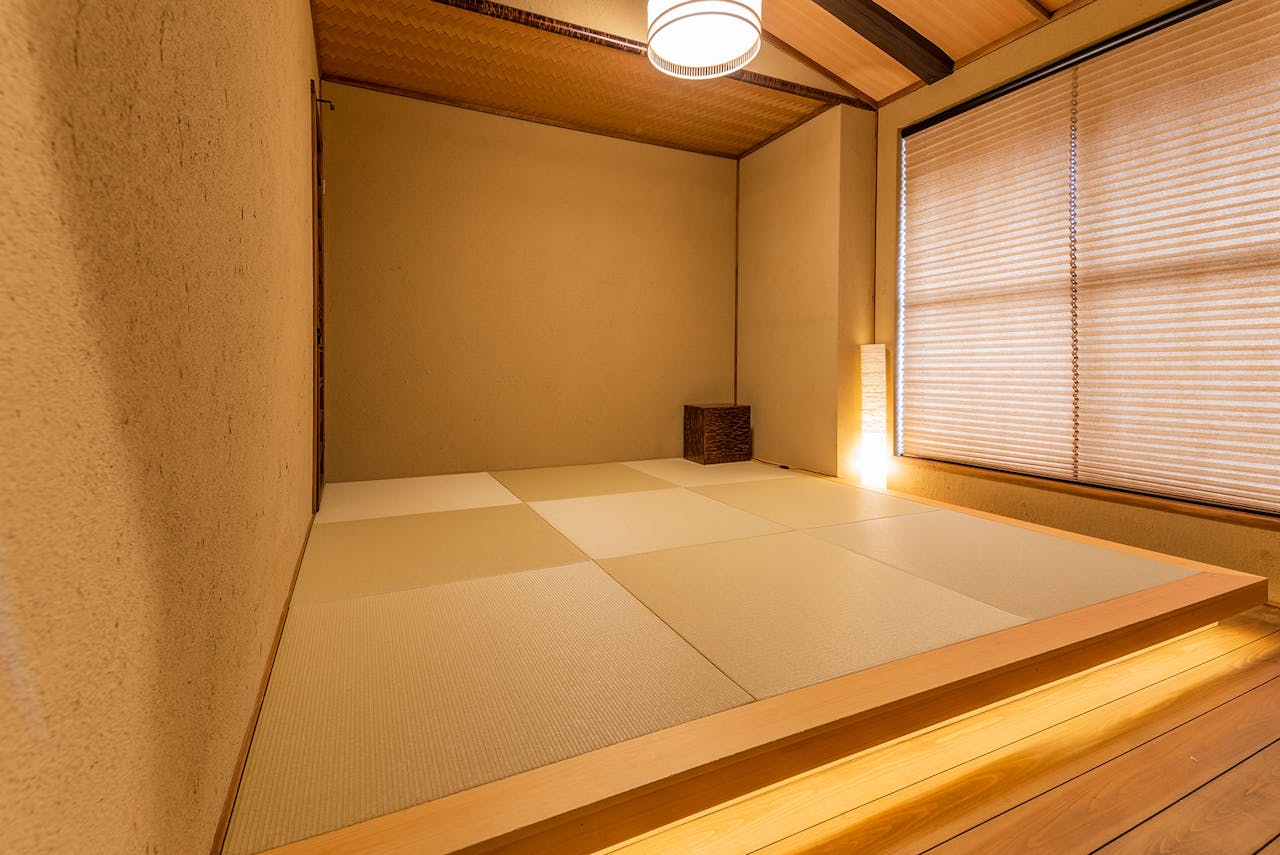 玄関を上がりすぐの「みせの間」には、デザイナーこだわりの特殊な左官仕上げが施されており、アクセントに天然の葉を壁全体に塗り込み、漆喰のような質感と土壁のような落ち着いた空間を演出しています。