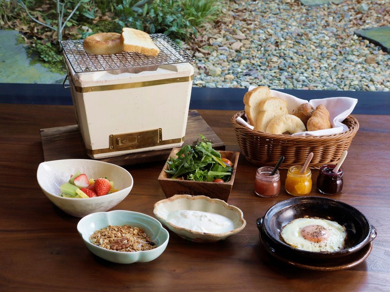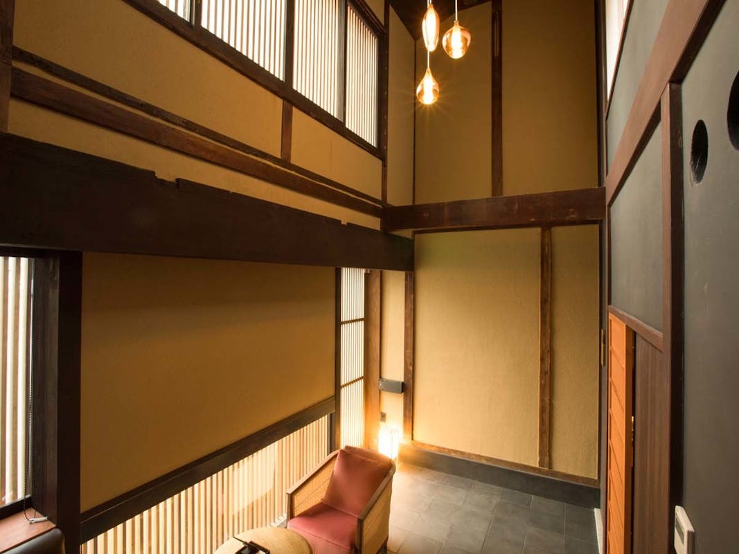 暮らすように滞在できる、町家スタイルの離れ。瓦敷きの土間は吹き抜けになっており、バスルームはシックな黒を基調、庭の緑が爽やかに映えます。二階に上がるとベッドルームとミニバーがあり、喧騒を忘れて心静かに寛ぐことができます。